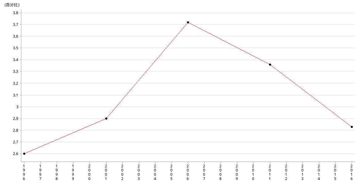 | 年份 | 1996 | 2001 | 2006 | 2011 | 2016 |