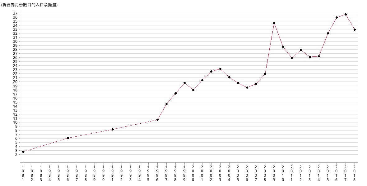 | 折合為月份數目的入口承擔量 | 34.63 | 28.66 | 25.92 | 27.94 | 26.20 | 26.40 | 32.10 | 36 |