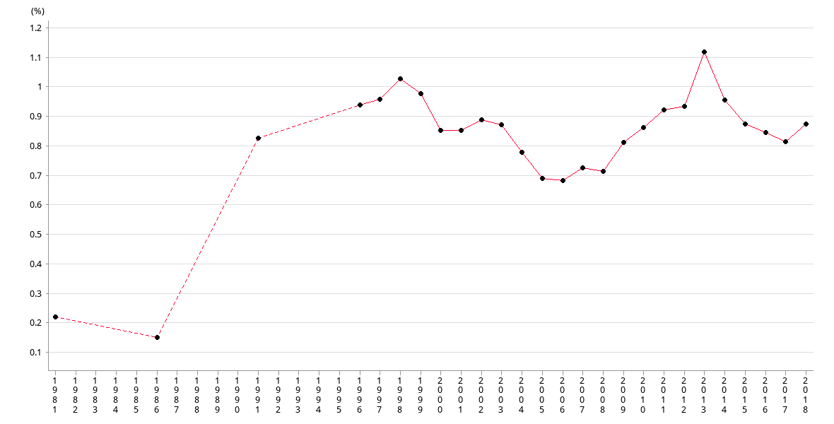 | 年份 | 1981 | 1986 | 1991 | 1996 | 1997 | 1998 | 1999 | 2000 |