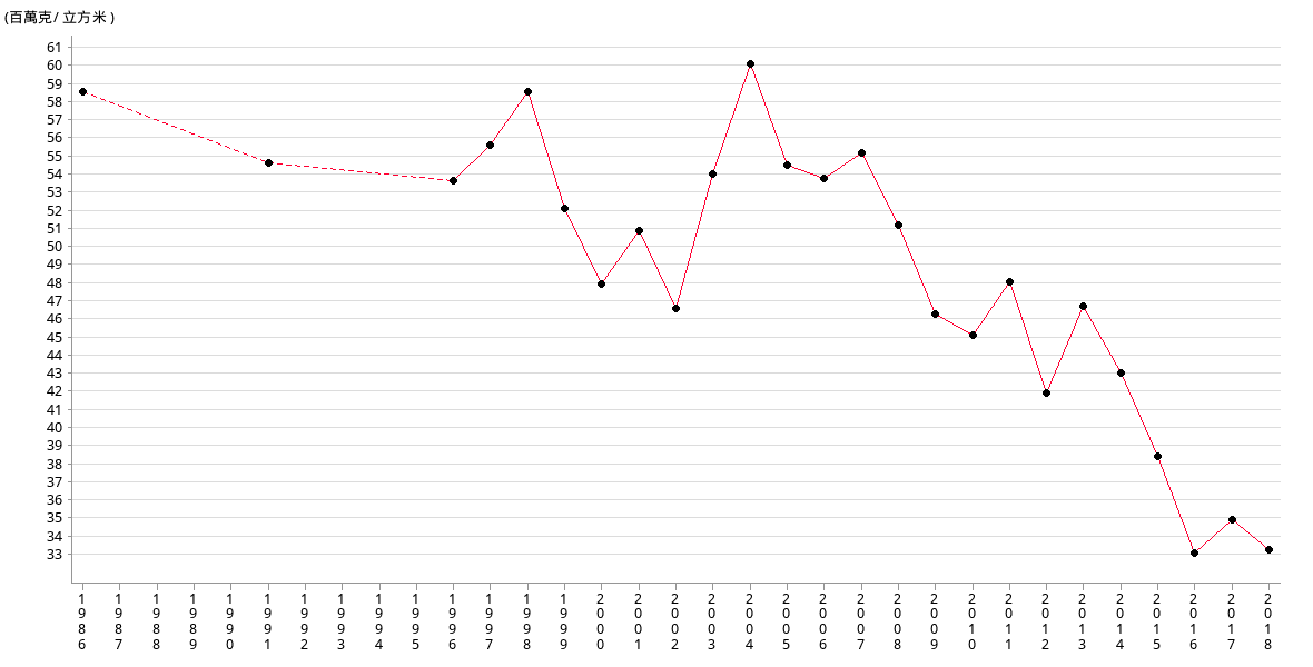 | 百萬克/ 立方米 | 59 | 55 | 54 | 56 | 59 | 52.45 | 48.18 | 51.20 |