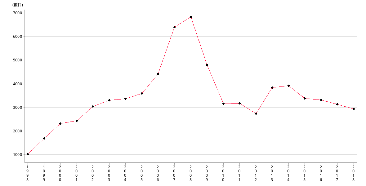 | 數目 | 4424 | 6404 | 6843 | 4807 | 3163 | 3174 | 2734 | 3836 |