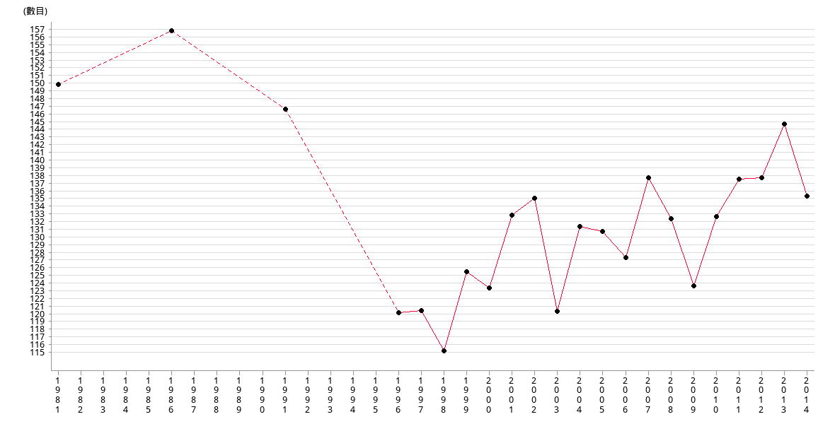 | 數目 | 149.50 | 156.36 | 146.31 | 120.10 | 120.37 | 115.15 | 125.35 | 123.26 |