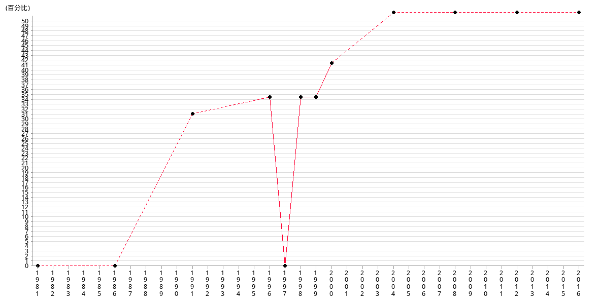 | 年份 | 1981 | 1986 | 1991 | 1996 | 1997 | 1998 | 1999 | 2000 |
