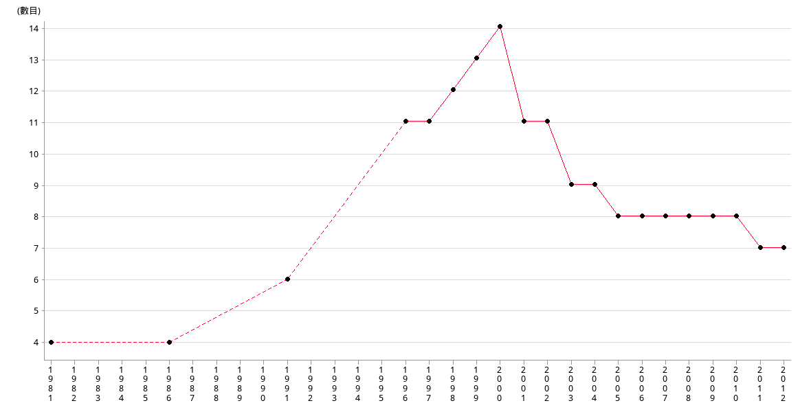 | 年份 | 1981 | 1986 | 1991 | 1996 | 1997 | 1998 | 1999 | 2000 |