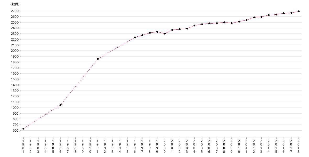 | 數目 | 634 | 1045 | 1843 | 2218 | 2255 | 2296 | 2314 | 2282 |