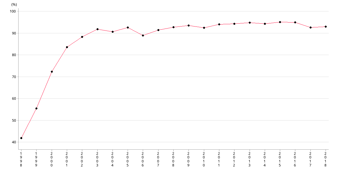 | 百分比 | 88.60 | 91 | 92.40 | 93.10 | 92.10 | 93.70 | 93.90 | 94.40 |
