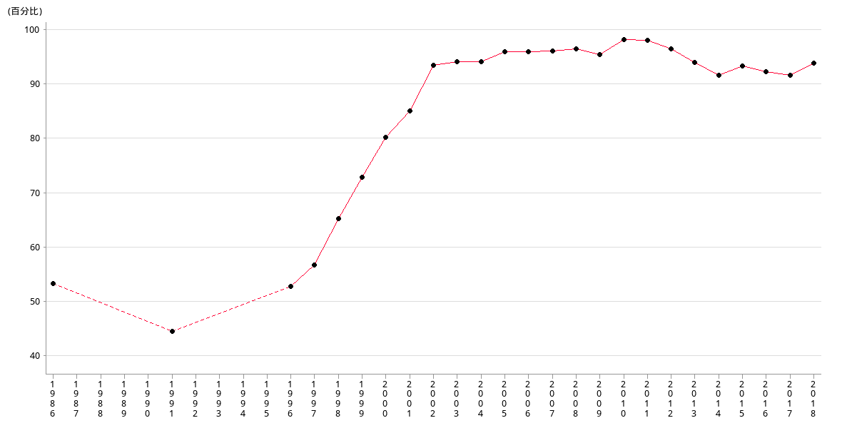 | 百分比 | 93.56 | 94.20 | 94.16 | 95.99 | 96.00 | 96.16 | 96.55 | 95.57 |