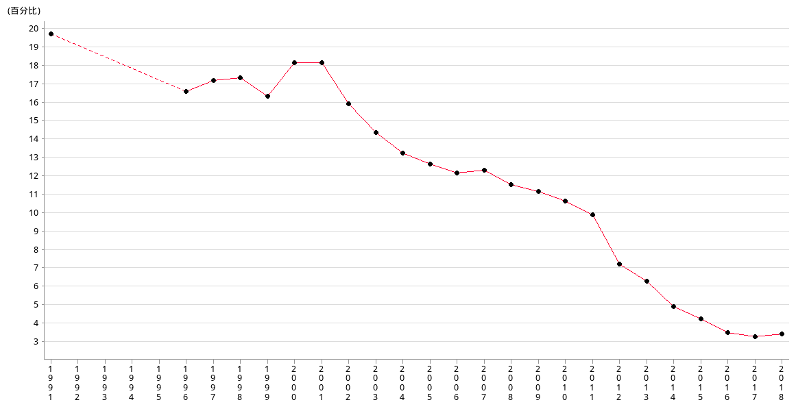 | 百分比 | 19.62 | 16.52 | 17.11 | 17.26 | 16.28 | 18.07 | 18.08 | 15.86 |