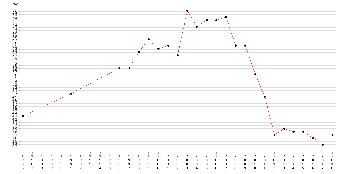 | 年份 | 1986 | 1991 | 1996 | 1997 | 1998 | 1999 | 2000 | 2001 |