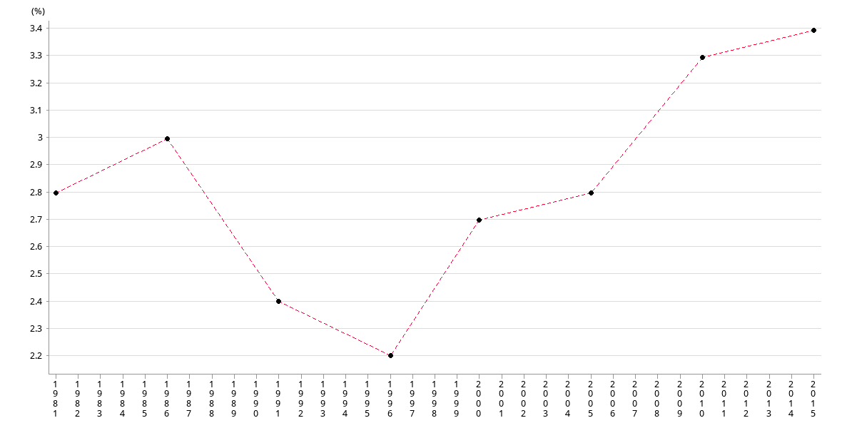 | Year | 1981 | 1986 | 1991 | 1996 | 2000 | 2005 | 2010 | 2015 |