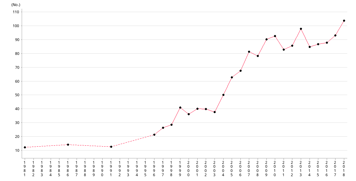Figure for 1981 is not available, since the Child Protection Services Unit (CPSU) had not set up until 1983. The number of active cases as at July 1983, which is extracted from the Study on Child Abuse conducted by the Research and Statistics Unit of Social Welfare Department, is used as a proxy for 1981. It includes cases handled by the CPSU, Family Service Centres and the Probation Offices of the Social Welfare Department.