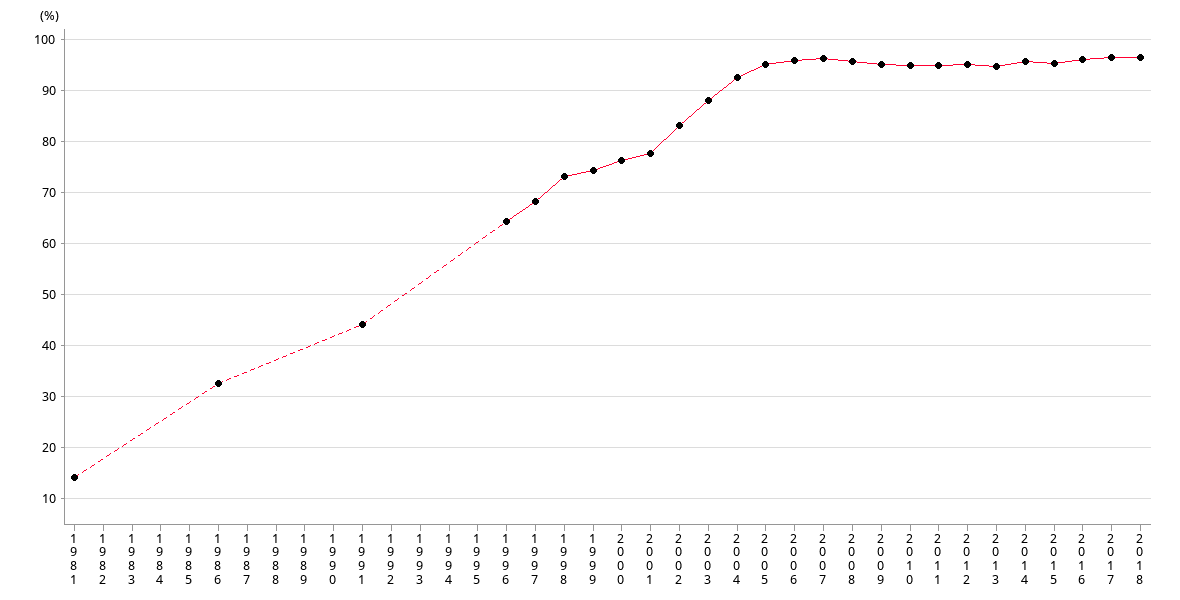 | % | 77.67 | 83.08 | 87.99 | 92.46 | 95.18 | 95.86 | 96.34 | 95.76 |