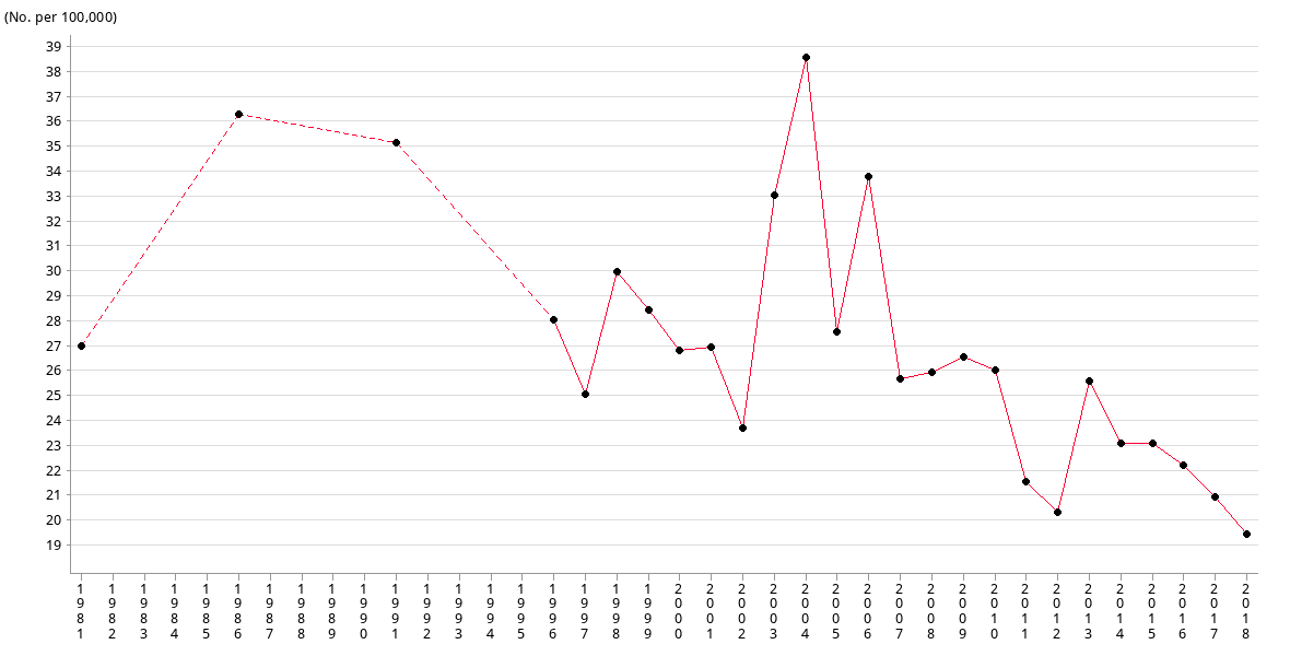 | No. per 100,000 | 26.90 | 36.11 | 35.01 | 27.97 | 24.98 | 29.85 | 28.37 | 26.76 |