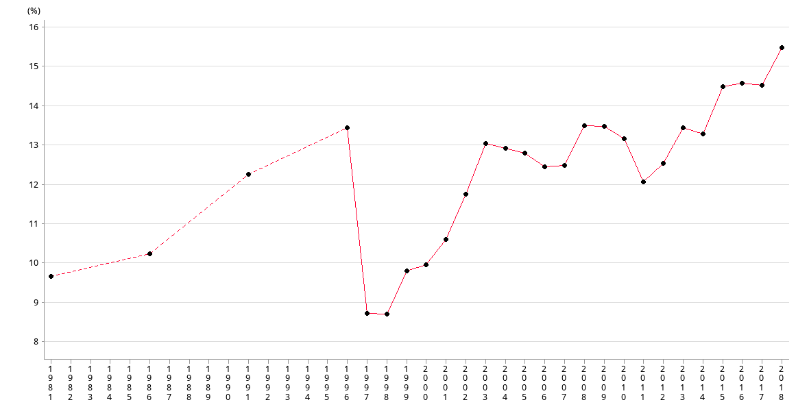 The number of employees who earn less than half of median income as percentage of the number of employed persons. Figures are obtained by adding the number of employed persons who fall within the income groups below 1/2 median income, based on the tables in the four censuses (by-censuses). Since the data are presented by income groups, the number of employed persons who fall within the income group where the median is found has to be obtained by further mathematical manipulation as follow: