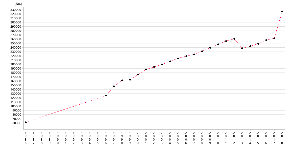 All figures are collected from Social Welfare Department since 1986. Number of disabled CSSA recipients is an estimate only. All figures refer to financial year, e.g., figure for 1981/82 is used for 1981.