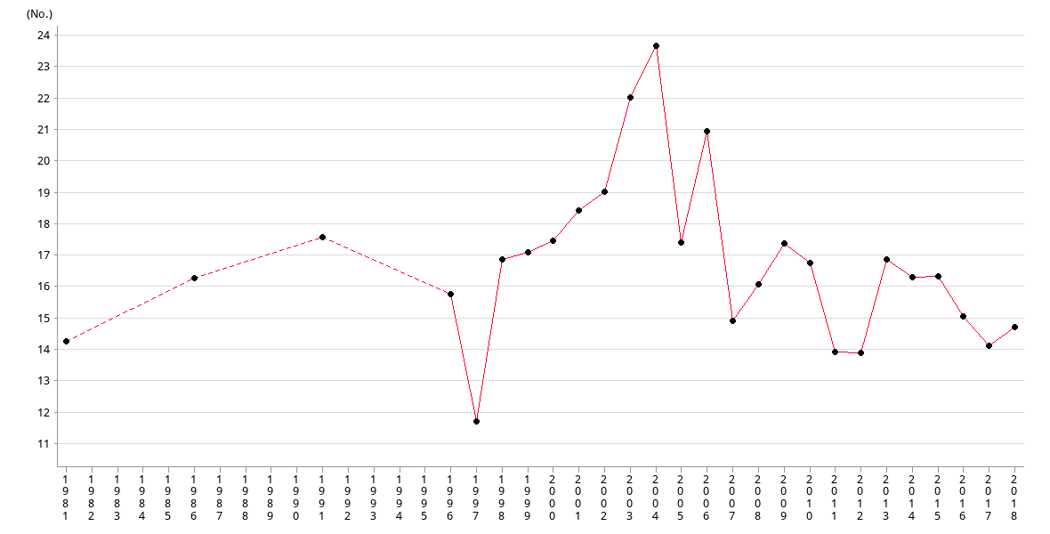 The number of suicides committed by persons aged 20 and over per 100,000 population, based on mid-year estimate of population. Figures exclude injury undetermined whether accidentally or purposely inflicted.