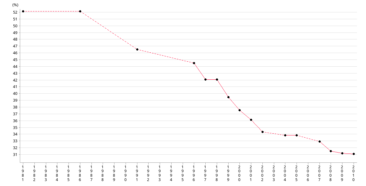| % | 36.10 | 34.30 | 33.80 | 33.80 | 32.90 | 31.50 | 31.20 | 31.10 |