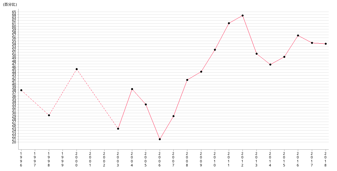 | % | 41.83 | 44.74 | 52.42 | 61.69 | 64.35 | 50.95 | 47.19 | 49.89 |