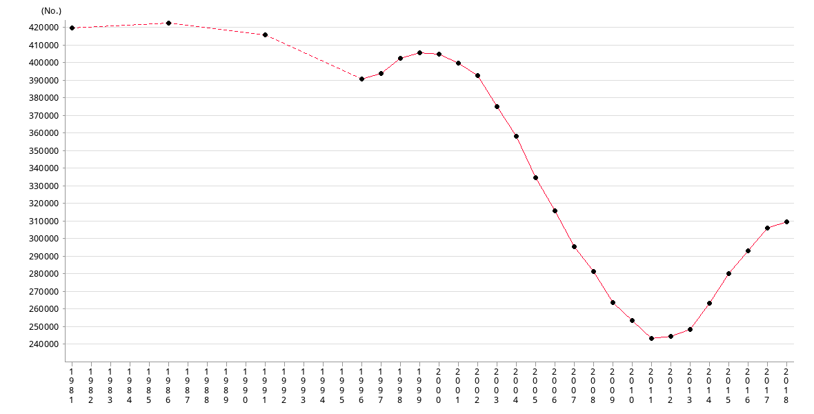 | 數目 | 416200 | 419000 | 412400 | 387600 | 390600 | 399100 | 402200 | 401500 |