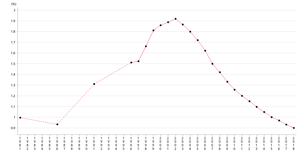 | 年份 | 1981 | 1986 | 1991 | 1996 | 1997 | 1998 | 1999 | 2000 |