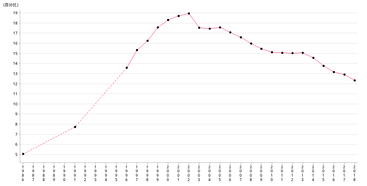| 百分比 | 18.79 | 17.38 | 17.31 | 17.41 | 16.94 | 16.45 | 15.86 | 15.34 |