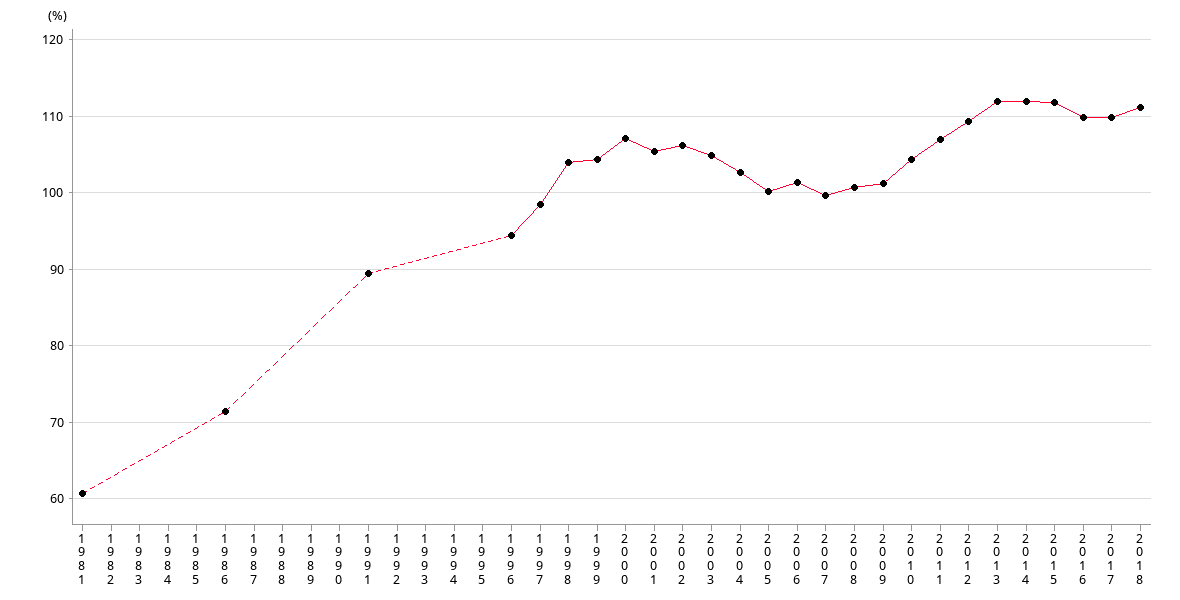 | 百分比 | 100.90 | 104 | 106.60 | 108.90 | 111.60 | 111.50 | 111.40 | 109.50 |
