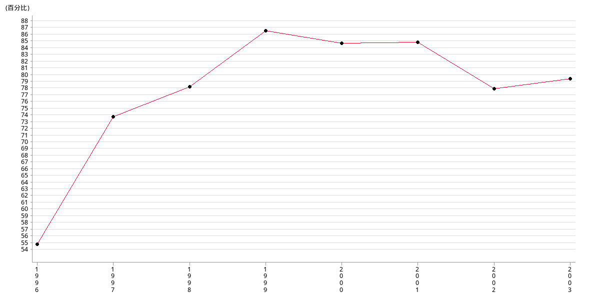 | % | 54.77 | 74.35 | 79.00 | 87.60 | 85.72 | 85.87 | 78.67 | 80.22 |