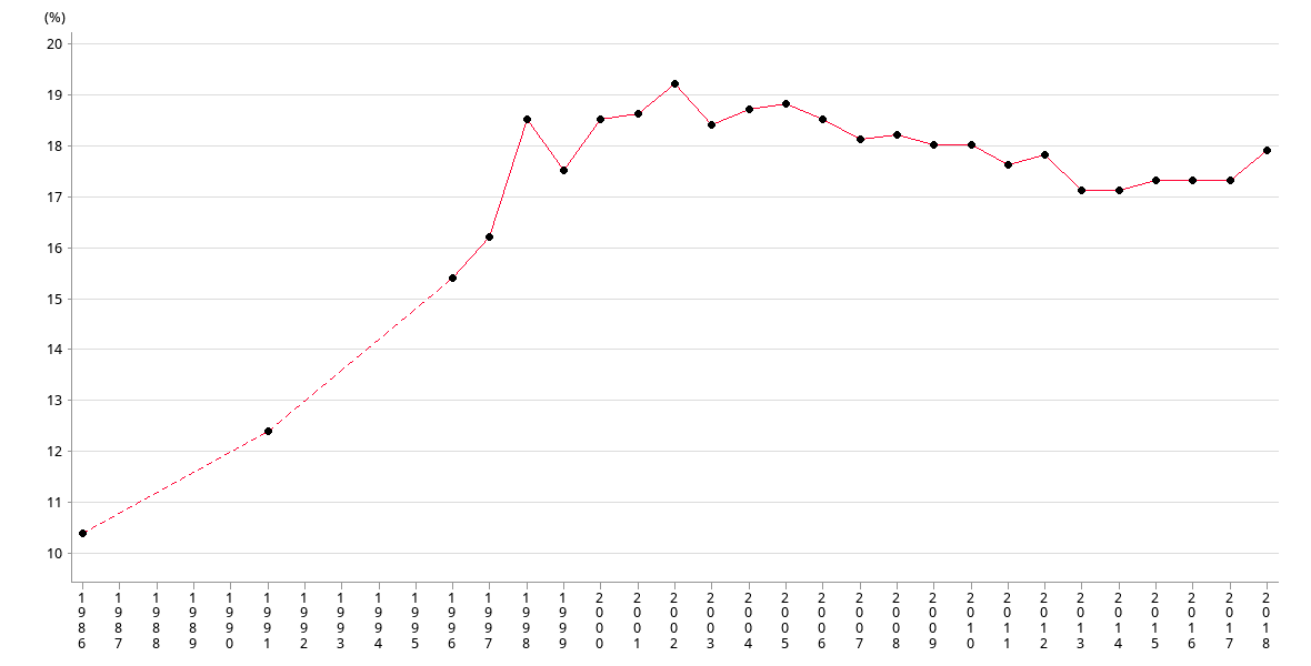 | % | 19.20 | 18.40 | 18.70 | 18.80 | 18.50 | 18.10 | 18.20 | 18 |