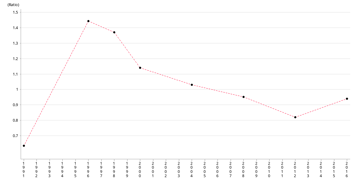 | Ratio | 0.63 | 1.44 | 1.37 | 1.14 | 1.03 | 0.95 | 0.82 | 0.94 |
