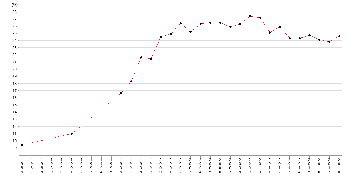 | % | 9.40 | 11 | 16.70 | 18.30 | 21.70 | 21.50 | 24.60 | 25 |